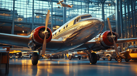 A vintage airplane stands proudly in a contemporary aviation museum, highlighting its shiny surface and powerful engines. Sunlight filters through large windows, illuminating the historic aircraft.