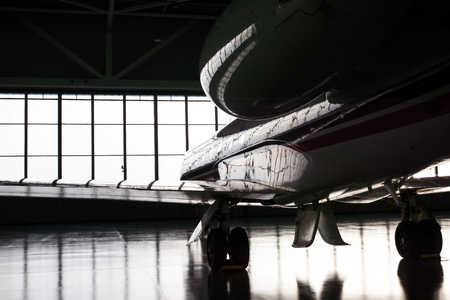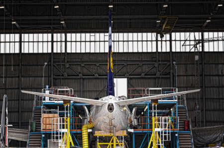 White passenger airplane in the hangar. Airliner under maintenance. Checking mechanical systems for flight operations