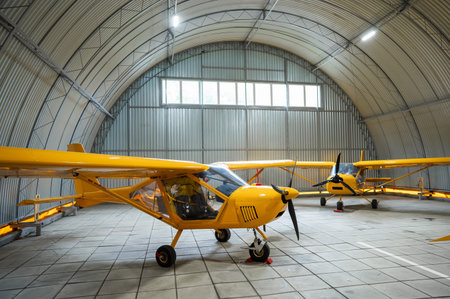 A large yellow airplane is parked in a hangar. The hangar is dimly lit, giving the scene a mysterious and somewhat eerie atmosphere