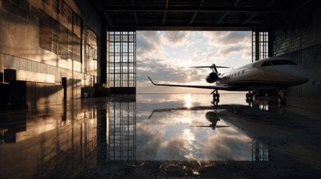 A stunning image of a luxurious private jet parked inside a modern hangar, showcasing a reflective floor. The dramatic sunset view enhances the serene atmosphere.