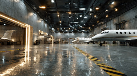 A spacious modern aircraft hangar featuring sleek private jets under bright industrial lighting, showcasing a clean floor and organized space.