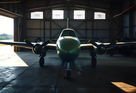 Green vintage airplane parked inside a hangar, with the door wide open, inviting light and casting intriguing shadows across the metal structure