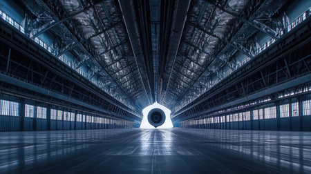 A captivating view of an industrial hangar interior featuring a jet engine at the center, showcasing modern architecture and design elements, emphasizing perspective and depth.