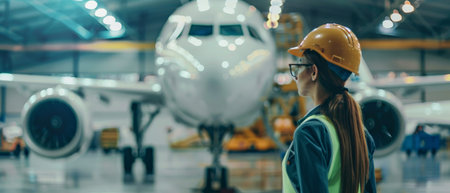 A female engineer in a hard hat and safety glasses looking at a passenger airplane in a hangar.