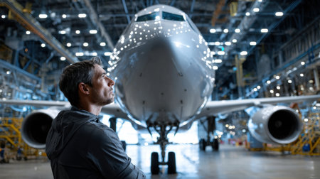 A man stands in front of a large airplane in a hangar. The man is looking at the plane with interest. The hangar is well-lit, and the airplane is the main focus of the scene