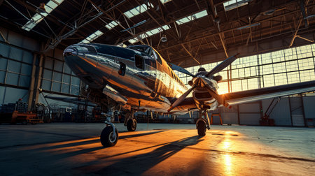 A sleek airplane parked in a spacious hangar, illuminated by warm sunlight through expansive windows, showcases the beauty of modern aviation and engineering excellence.