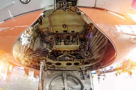 White passenger jet plane in the aviation hangar. Aircraft under maintenance. Checking mechanical systems for flight operations