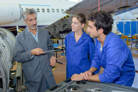 engineering teacher checking airplane engines with his students
