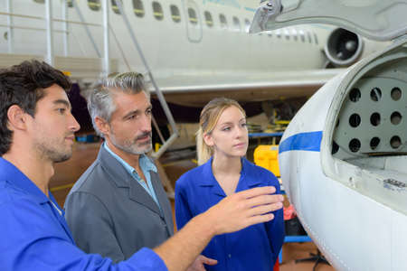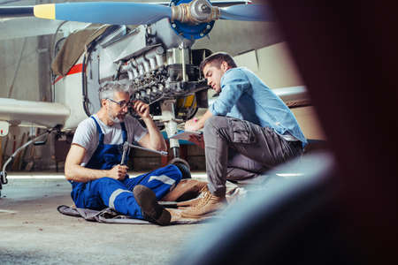 Aircraft mechanics in the hangar. Coworkers repairing an aircraft