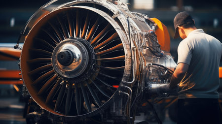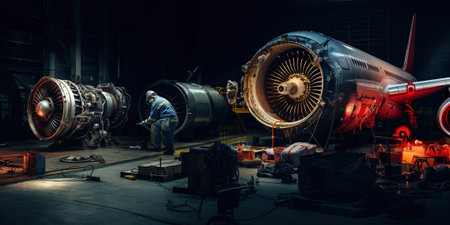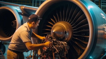 Aircraft mechanic repairs an aircraft engine in an airport hangar