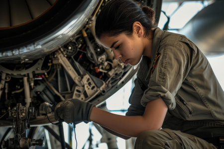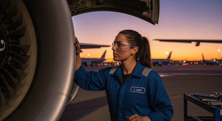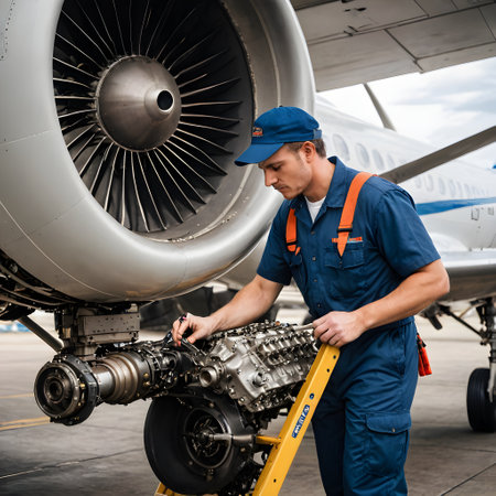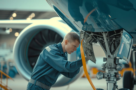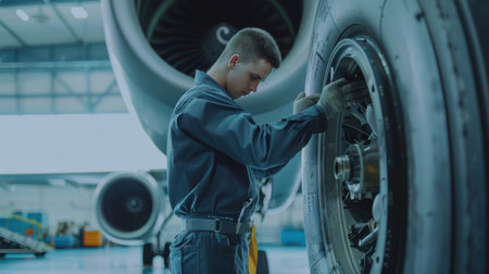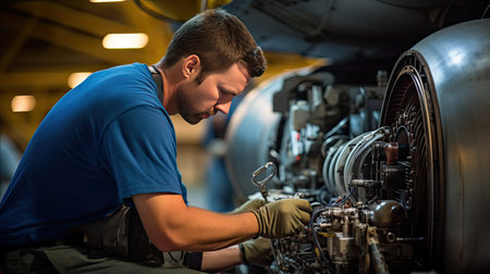 Skilled young airplane mechanic plane check engine avionics hangar industry technology experienced engineer safety scheduled maintenance transportation jet airport repair inspection replacement part