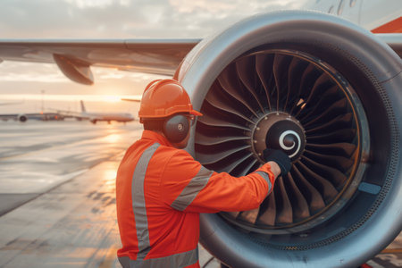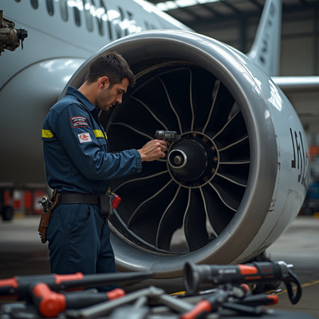 A dedicated technician in protective gear meticulously inspects an aircraft engine in an aviation hangar
