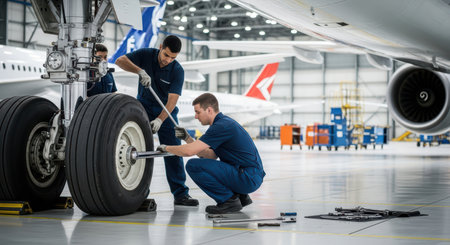 Male mechanics maintaining aircraft landing gear in hangar