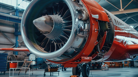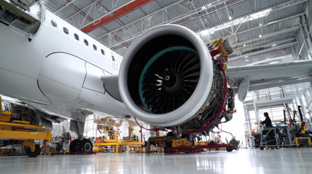 Close-up detail of a powerful jet engine undergoing maintenance within an aircraft hangar. The image showcases the intricate engineering and powerful mechanics of modern aviation technology. Ideal for illustrating concepts related to aerospace, aviation maintenance, or industrial machinery.