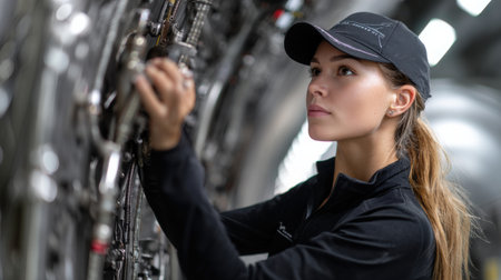 A woman is working on a jet engine. She is wearing a black hat and a black jacket