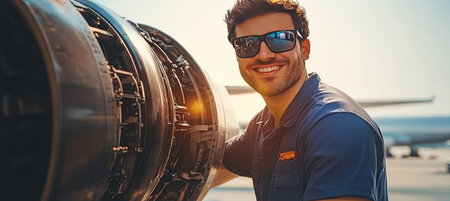 Confident Aviation Engineer Inspecting Aircraft Engine, Aerospace Industry, Maintenance, Technology
