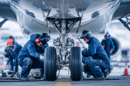 Ground crew conducting maintenance checks on parked aircraft to ensure operational readiness and safety before departure or further servicing.AI Generated