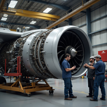 An intricate close-up of an aircraft engine in a maintenance shop, showcasing advanced technology, tools, and professionals engaged in crucial repairs.