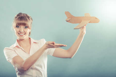 Travel. Journeys. Vacation. Voyage. A girl with documents and a model of the plane in her hands. A woman is going to fly. A woman controls a toy plane.