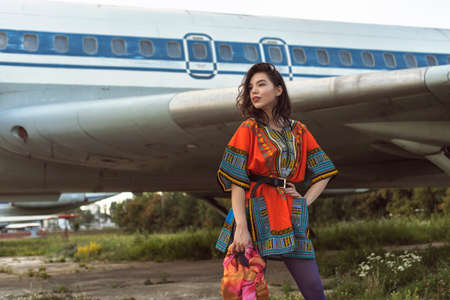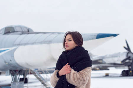 Beautiful young business woman near the airplane jet at sunny day in airport