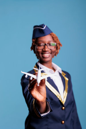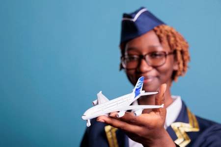 Aircraft attendant in crew uniform looking at model airplane, holding it in his hands with a smile. Female professional flight assistant with commercial toy airplane in studio shot.