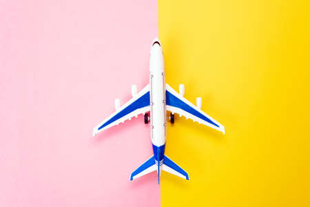Toy model of plane on a blue-pink pastel background. The concept of tourism, air travel, minimalism. Top view