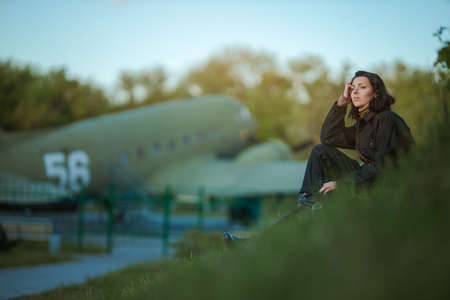 young beautiful girl sits on the grass on the background of a small plane in Ukraine in the spring, rest travel