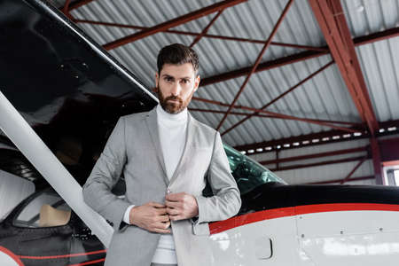 low angle view of bearded businessman adjusting blazer near modern helicopter