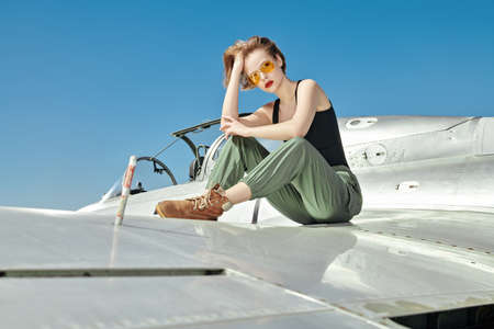 Beautiful girl pilot sits on the wing of a fighter airplane at the airfield.