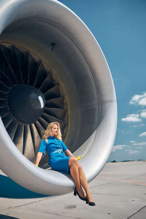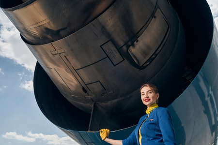 Portrait of a beautiful stewardess in uniform standing in front of an airplane engine.