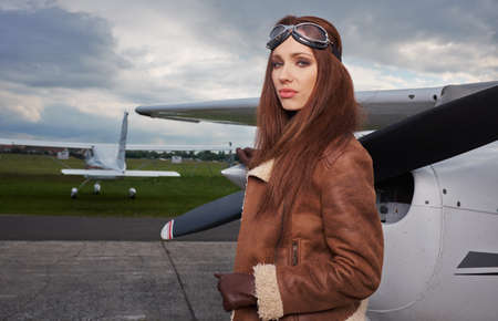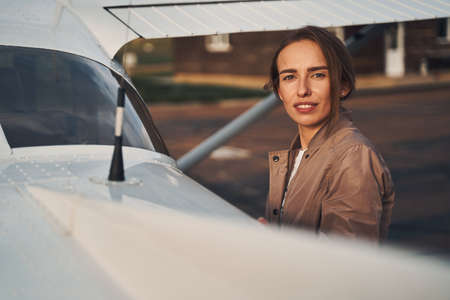 Attractive woman pilot wearing sunglasses standing in the sunshine on an airfield resting against her small private airplane