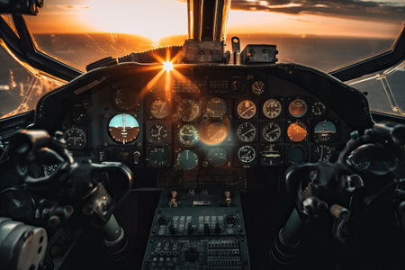 Empty Airplane cockpit with illuminated control panels and scenic view, concept of aviation, aircraft operation, pilot training.