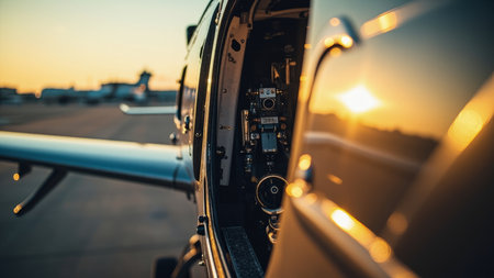 Helicopter cockpit interior with open door at sunset showing instruments and exterior airport runway view