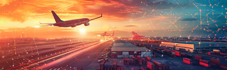 Cargo plane and truck in a busy transport yard illustrating the logistics of import and export. Concept Transportation, Logistics, Cargo Handling, Import and Export, Shipping Industry