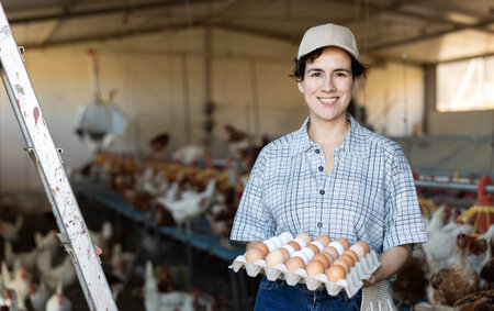 Successful hispanic female owner of poultry farm holding tray of eggs in henhouse