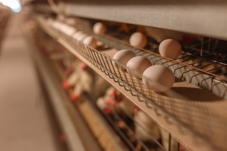 Poultry farm, chickens sit in open-air cages and eat mixed feed, on conveyor belts lie hen's eggs, modern farming
