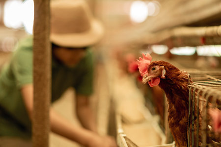 Chicken farm eggs selective point, hens doing eating food, egg chicken farm