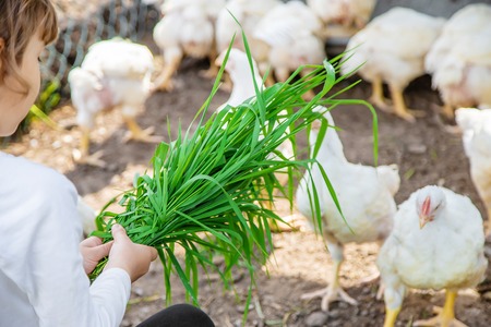Bio chickens on a home farm a children. nature.