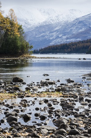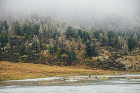 Colorful autumn landscape with mountain lake and coniferous forest with hoarfrost on hillside in golden sunshine under low clouds. Scenic view to beautiful yellow larches trees with frost in sunlight.