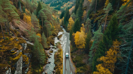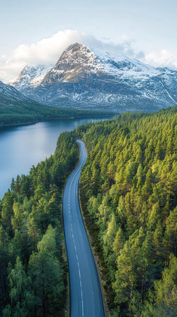 Aerial view serpentine road winding through lush and dense forest leading to majestic mountain peak