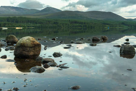 View of the Loch Garten near the Aviemore tourist resort, Cairngorms National Park, Scotland, with a group of stones on the calm water and snowy mountains on the background, reflected on the lake.