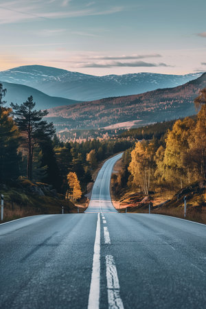 Road with Scenic Landscape View of Mountain, Forest in Scottish Highlands. Concept of Road trip, vacation.