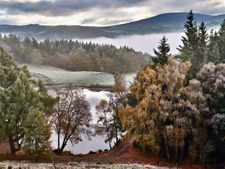 A cold autumn scene above Llyn Bodweni near Llandderfel Wales with early morning frost on trees and mist in the River Dee valley below. There are dark clouds above and hills and in the background.