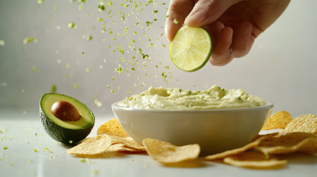 Fresh guacamole in a bowl with tortilla chips, highlighted by a hand squeezing lime juice over it. An avocado half sits nearby, emphasizing the vibrant, appetizing scene