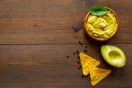 Fresh homemade hot guacamole sauce with nachos on dark background,top view