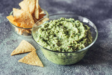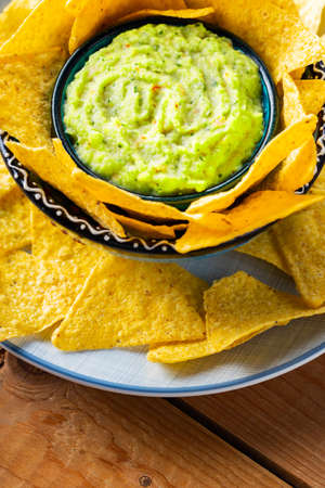 Guacamole sauce and nacho chips. Tortilla chips and Mexican guacamole sauce in a bowl. Close-up