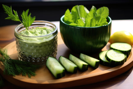 freshly sliced cucumber pieces beside a pot of hummus, created with generative ai