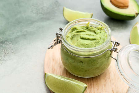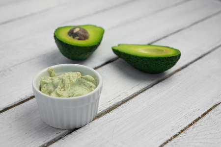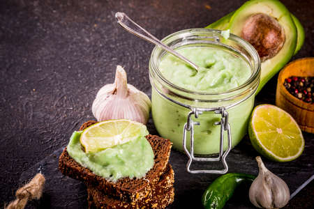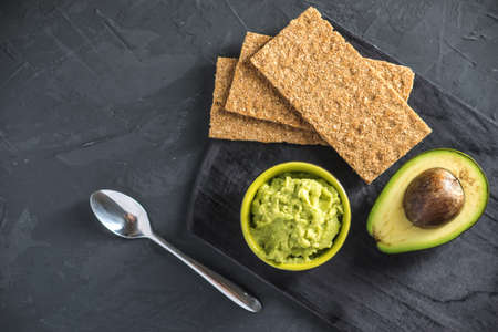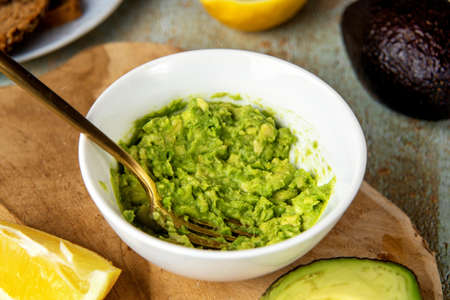 Cold appetizer of mashed avocado flesh with bread on the table. Concept traditional mexican food from organic eco products