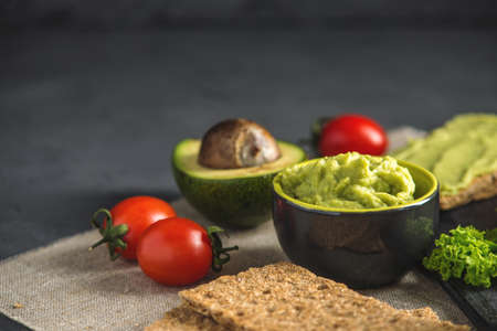 Traditional Mexican cold appetizer made of pureed avocado pulp with bread and vegetables on a dark background. Concept healthy vegetarian Breakfast