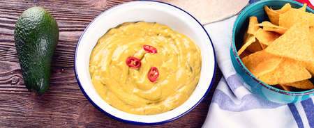 Mexican corn chips nachos with avocado red pepper sauce, top view